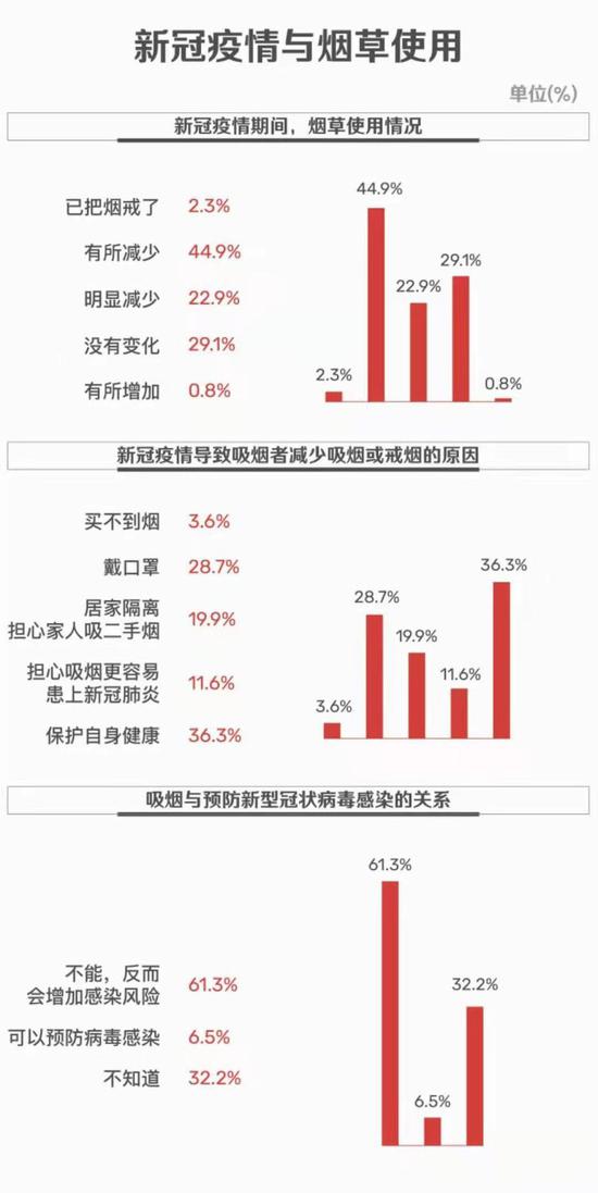 《报告》显示,疫情期间,67.8%的吸烟者吸烟量减少,2.3%的吸烟者戒烟,其戒烟或减少吸烟的原因排名前三位的是保护自身健康(36.2%)、戴口罩(28.7%)、居家隔离担心家人吸二手烟(19.9%)。61.3%的吸烟者认为吸烟并不能预防新型冠状病毒感染,反而增加感染风险。