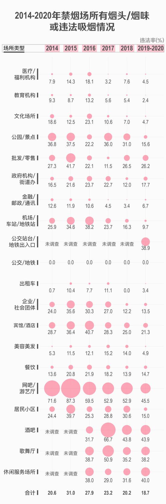在场所吸烟情况部分,本次调查显示场所有烟头、烟味或违法吸烟情况为18.7%,为历年来最低。