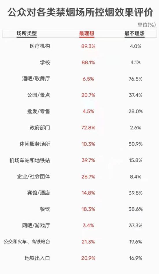 《报告》显示,最理想的前三类依次是医疗机构(89.3%)、学校(88.1%)和政府部门(72.8%);最不理想的三类场所依次是酒吧/歌舞厅(76.5%)、网吧/游艺厅(73.3%)和休闲服务场所(50.9%)。