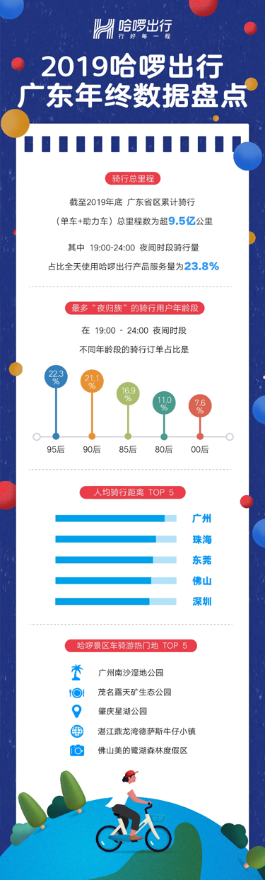 近日,哈啰出行正式发布2019年度数据盘点。盘点显示,哈啰累计全国注册用户已超过3亿。哈啰方面数据显示,其用户分布逐渐从80、90为代表的的“互联网人群”走向全年龄段,60后和70后用户群体增长明显。广东方面,2019年两轮累计骑行总里程超9.5亿公里,人均骑行距离前5名分别是广州、珠海、东莞、佛山和深圳。